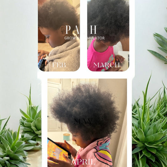 These hair growth results from February to April are from my daughter Lauren. My baby experienced a lot of breakage as her hair was transitioning from texturized to natural. Her hair was breaking at the line of demarcation. This is where the new growth and chemically processed hair meets. We did a big chop to get rid of the texturized hair that was still hanging on. After the big chop, I started using my homemade natural hair oil each night at bedtime. I noticed an improvement in her hair's elasticity and fullness in about 2 1/2 weeks. The growth she received in 2 months is what some people struggle to get in a whole year. My daughter has beautiful tightly coiled/kinky textured hair. Sometimes this hair texture requires a little extra love and may even be a little tricky to figure out what it needs to really thrive. After trying so many hair products over the years that didn't work; I decided to do my own research to figure out the best natural herbs and oils that contribute to hair growth, hair strengthening and that prevent hair loss. Look at my daughter's hair. Does Growth Stimulator work? I would say the proof is in the pudding!